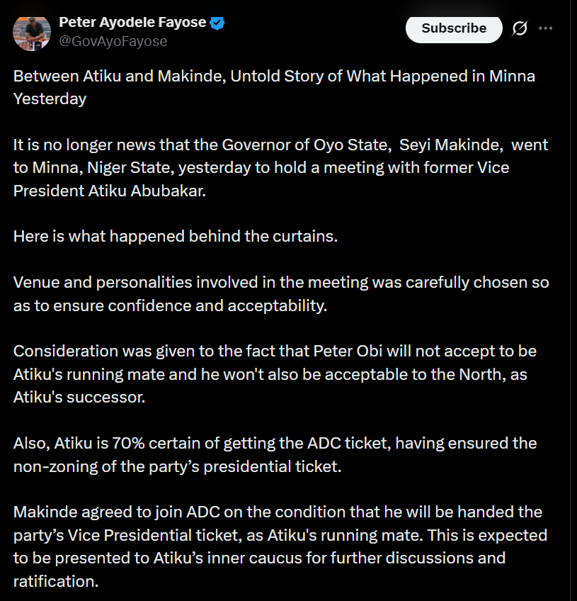 Former Ekiti State Governor Ayodele Fayose has alleged details of discussions that reportedly took place between Oyo State Governor Seyi Makinde and former Vice President Atiku Abubakar during their recent meeting in Minna, Niger State.